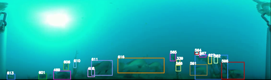 Dans le cadre de la collaboration avec l’entreprise néo-calédonienne VISIOON, nous avons développé des algorithmes de suivi et de comptage des espèces de poisson (cf. figure 1). Ces algorithmes sont appliqués sur des vidéos acquises à partir de caméras sous-marines 360° posées sur les fonds marins (profondeur de 5 à 20m).